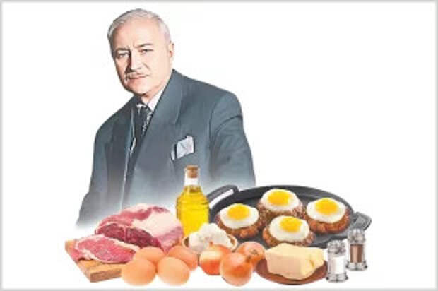 Ингредиенты: говядина (толстый край) — 600 г, лук репчатый — 400 г, яйца — 4 шт., животный жир для жарки — 100 г, масло растительное — 60 г, масло сливочное — 60 г, соль, перец по вкусу.